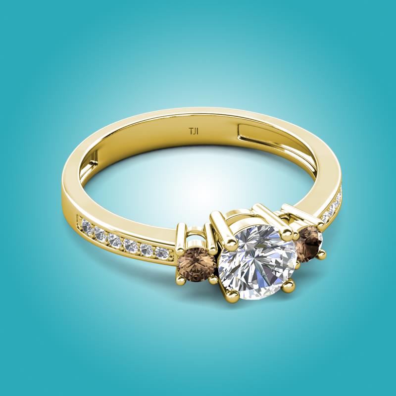 IGI Certified Three Stone Round Lab Grown Diamond and Smoky Quartz accented Diamond Engagement Ring in 14K Yellow Gold More Details ...