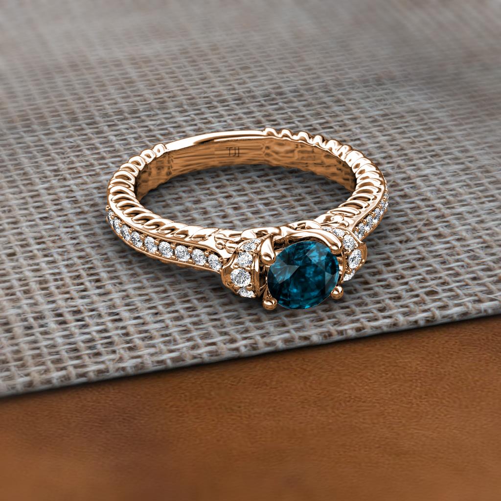 This Glamorous Engagement Ring features Center Blue Diamond flanked by series of Diamonds further forming remarkable combination with bubble cable design making it extraordinary and vintage.