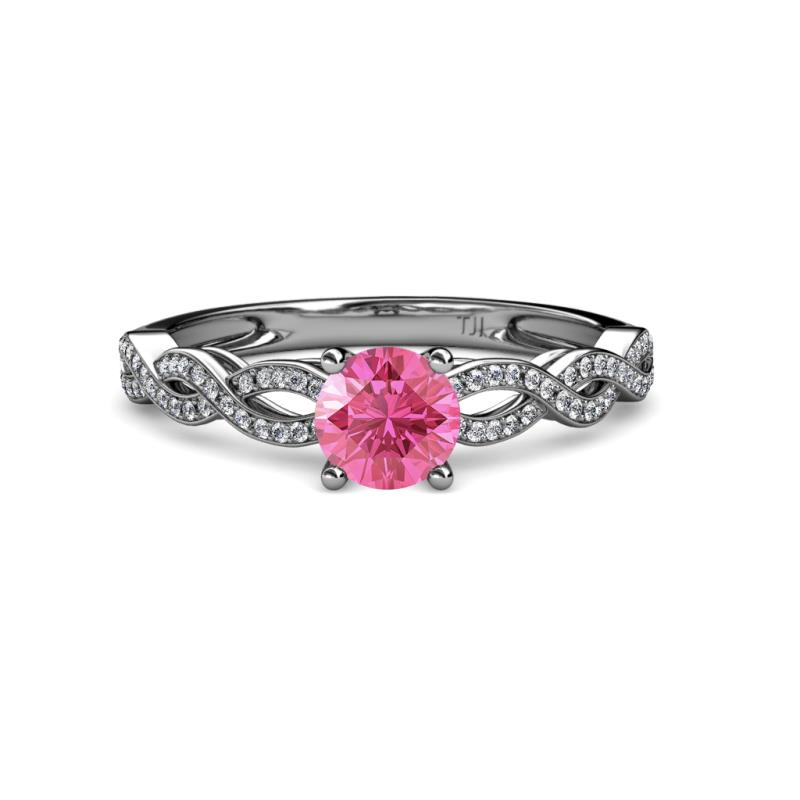 Honour the one You love by this Infinity Engagement Ring with 4 Prong Center Pink Tourmaline and open split crossover Shank framed by Pave Set smaller accent Diamonds will surely make one's Heart flutter.