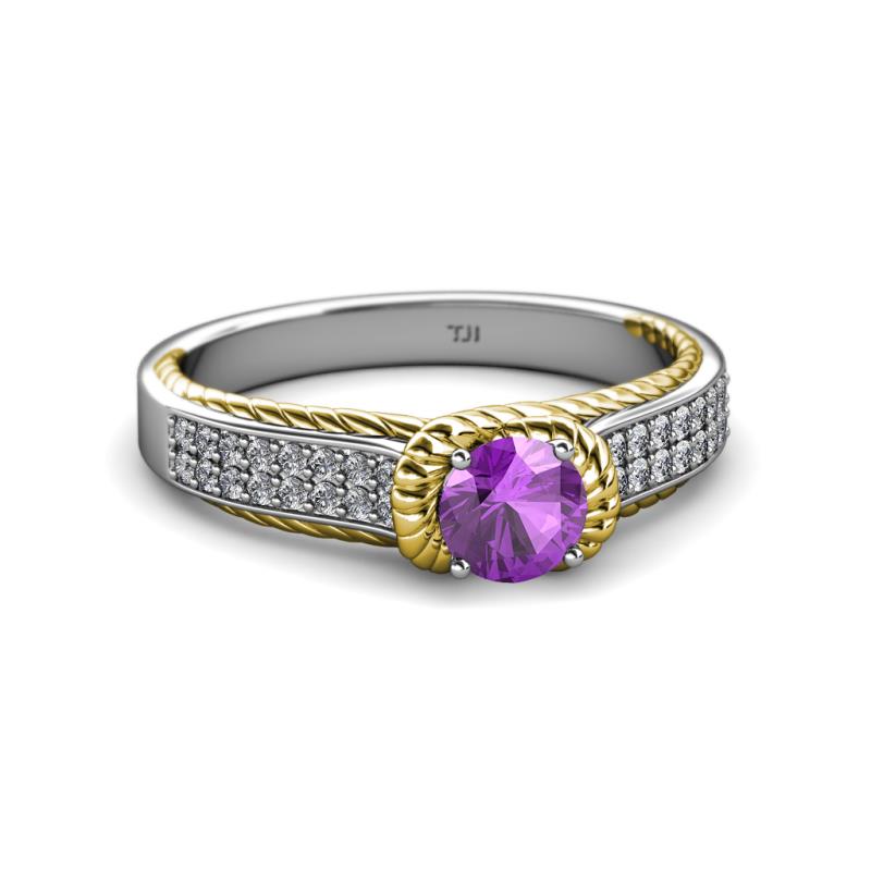 This Elegantly Designed Two Tone Solitaire Plus Engegement Ring in 14K White Gold have Double Row of Diamonds with Amethyst that is artstically surrounded with Yellow Gold Rope which continues to adorn the Shank overlapping below the Head giving a Heavenly beauty and timeless Elegance.