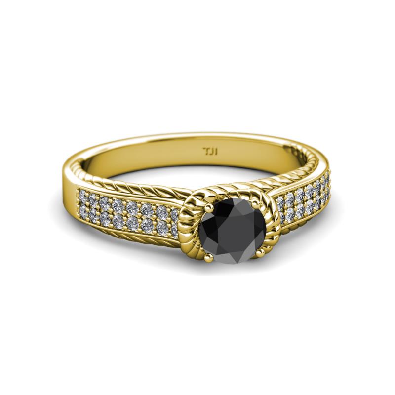 This Elegantly Designed Solitaire Plus Engagement Ring in 14K Yellow Gold have Double Row of Diamonds with Black Diamond that is artstically surrounded with Yellow Gold Rope which continues to adorn the Shank overlapping below the Head giving a Heavenly beauty and timeless Elegance.