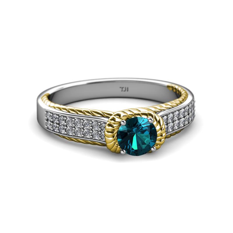 This Elegantly Designed Two Tone Solitaire Plus Engegement Ring in 18K White Gold have Double Row of Diamonds with Blue Diamond that is artstically surrounded with Yellow Gold Rope which continues to adorn the Shank overlapping below the Head giving a Heavenly beauty and timeless Elegance.