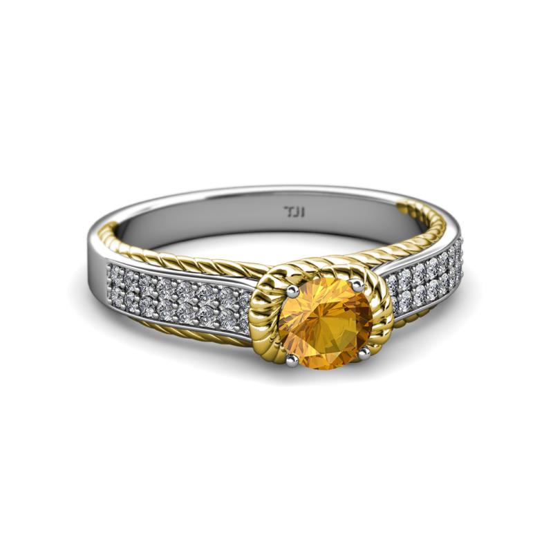This Elegantly Designed Two Tone Solitaire Plus Engegement Ring in 14K White Gold have Double Row of Diamonds with Citrine that is artstically surrounded with Yellow Gold Rope which continues to adorn the Shank overlapping below the Head giving a Heavenly beauty and timeless Elegance.