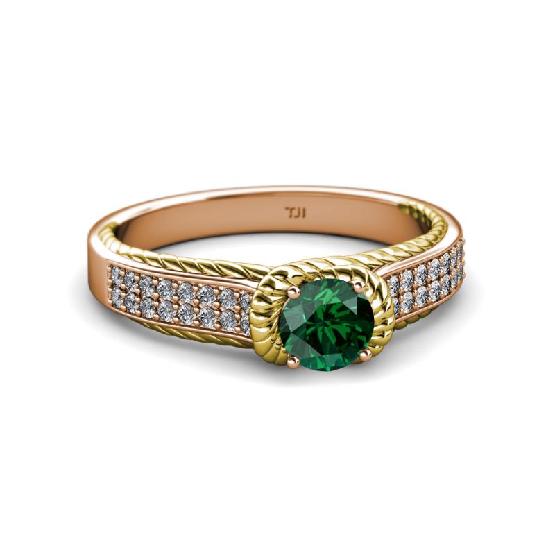 This Elegantly Designed Two Tone Solitaire Plus Engegement Ring in 18K Rose Gold have Double Row of Diamonds with Emerald that is artstically surrounded with Yellow Gold Rope which continues to adorn the Shank overlapping below the Head giving a Heavenly beauty and timeless Elegance.