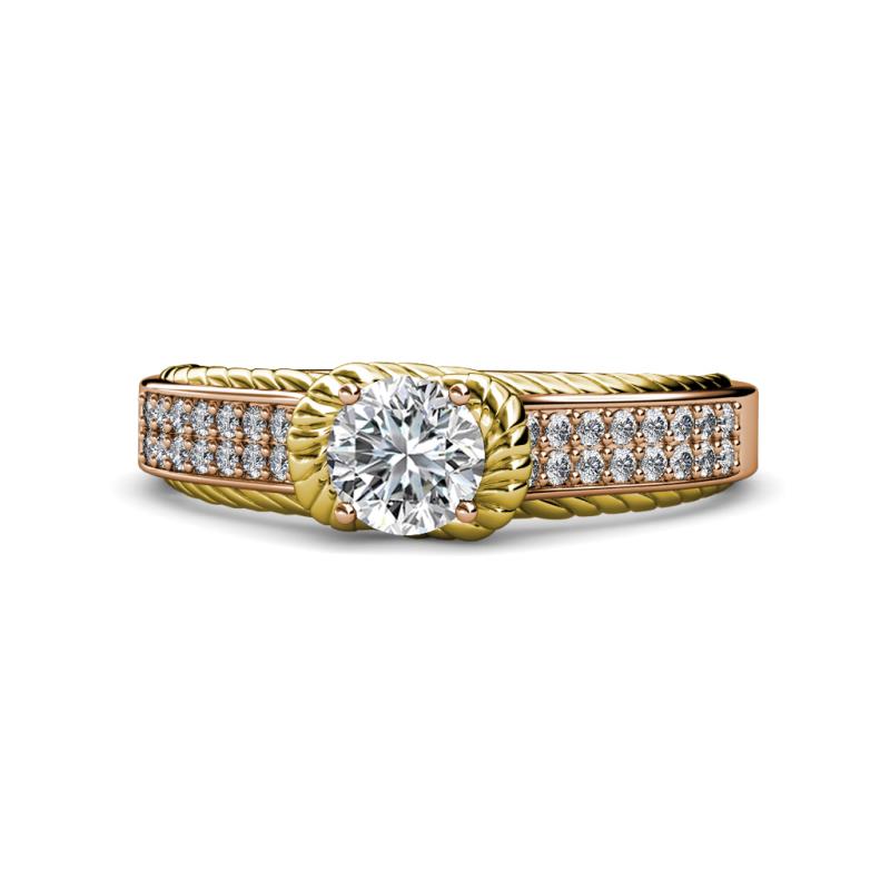 This Elegantly Designed Two Tone Solitaire Plus Engegement Ring of 1.22 ctw, have Double Row of Round Natural Diamonds with center IGI Certified Round Lab Grown Diamond that is artstically surrounded with Yellow Gold Rope which continues to adorn the Shank overlapping below the Head giving a Heavenly beauty and timeless Elegance.