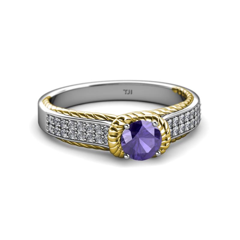 This Elegantly Designed Two Tone Solitaire Plus Engegement Ring in Platinum have Double Row of Diamonds with Iolite that is artstically surrounded with Yellow Gold Rope which continues to adorn the Shank overlapping below the Head giving a Heavenly beauty and timeless Elegance.