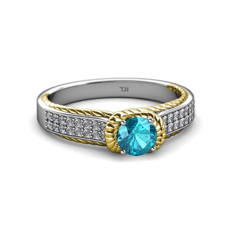 This Elegantly Designed Two Tone Solitaire Plus Engegement Ring in 18K White Gold have Double Row of Diamonds with London Blue Topaz that is artstically surrounded with Yellow Gold Rope which continues to adorn the Shank overlapping below the Head giving a Heavenly beauty and timeless Elegance.