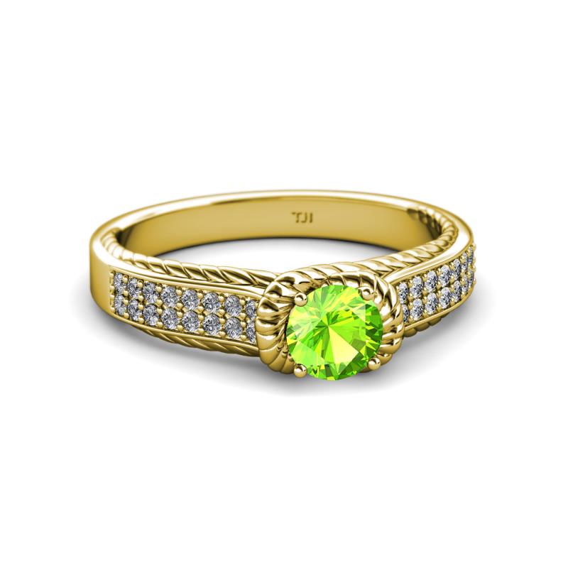 This Elegantly Designed Solitaire Plus Engagement Ring in 18K Yellow Gold have Double Row of Diamonds with Peridot that is artstically surrounded with Yellow Gold Rope which continues to adorn the Shank overlapping below the Head giving a Heavenly beauty and timeless Elegance.
