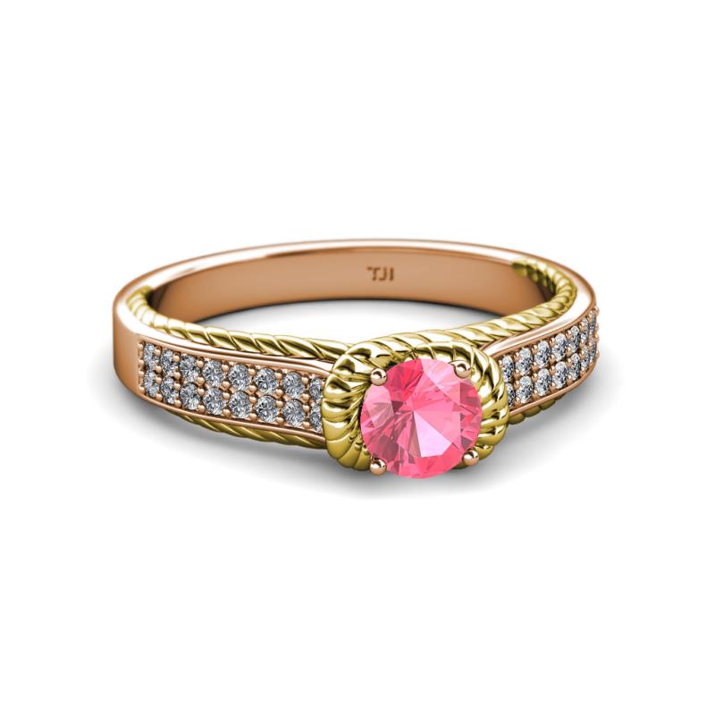 This Elegantly Designed Two Tone Solitaire Plus Engegement Ring in 14K Rose Gold have Double Row of Diamonds with Pink Tourmaline that is artstically surrounded with Yellow Gold Rope which continues to adorn the Shank overlapping below the Head giving a Heavenly beauty and timeless Elegance.