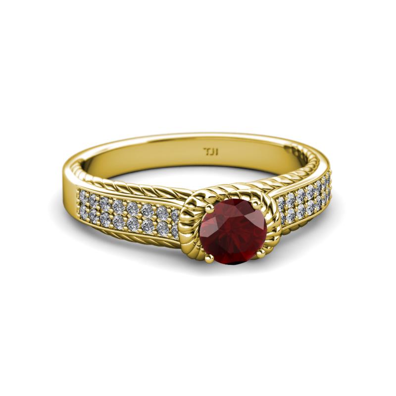 This Elegantly Designed Solitaire Plus Engagement Ring in 18K Yellow Gold have Double Row of Diamonds with Red Garnet that is artstically surrounded with Yellow Gold Rope which continues to adorn the Shank overlapping below the Head giving a Heavenly beauty and timeless Elegance.