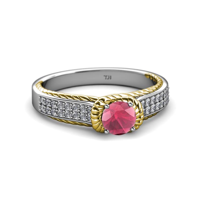 This Elegantly Designed Two Tone Solitaire Plus Engegement Ring in Platinum have Double Row of Diamonds with Rhodolite Garnet that is artstically surrounded with Yellow Gold Rope which continues to adorn the Shank overlapping below the Head giving a Heavenly beauty and timeless Elegance.