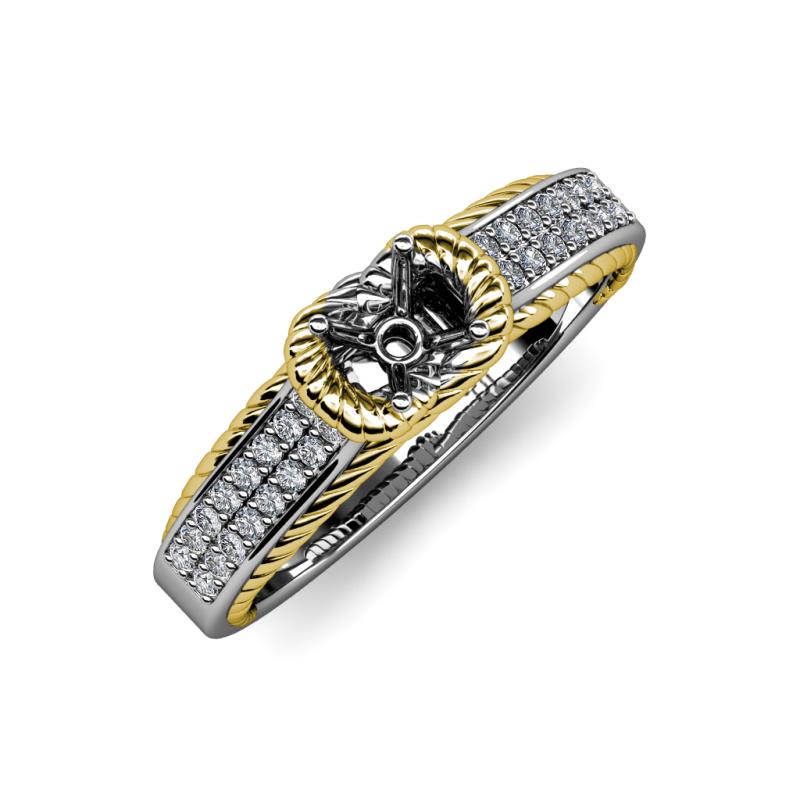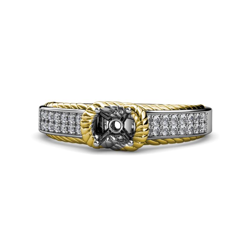 This Elegantly Designed Semi Mount Two Tone Solitaire Plus Engegement Ring in 14K White Gold have Double Row of Diamonds that is artstically surrounded with Yellow Gold Rope which continues to adorn the Shank overlapping below the Head giving a Heavenly beauty and timeless Elegance.