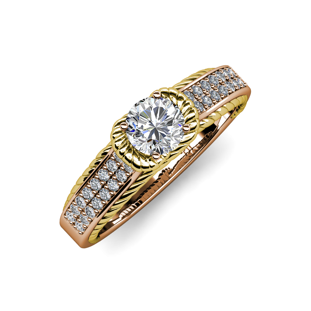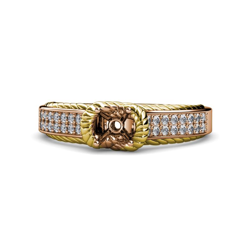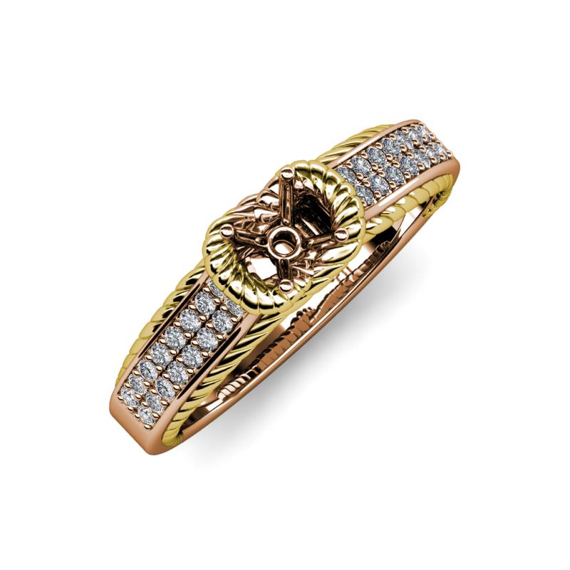 This Elegantly Designed Semi Mount Two Tone Solitaire Plus Engegement Ring in 14K Rose Gold have Double Row of Diamonds that is artstically surrounded with Yellow Gold Rope which continues to adorn the Shank overlapping below the Head giving a Heavenly beauty and timeless Elegance.