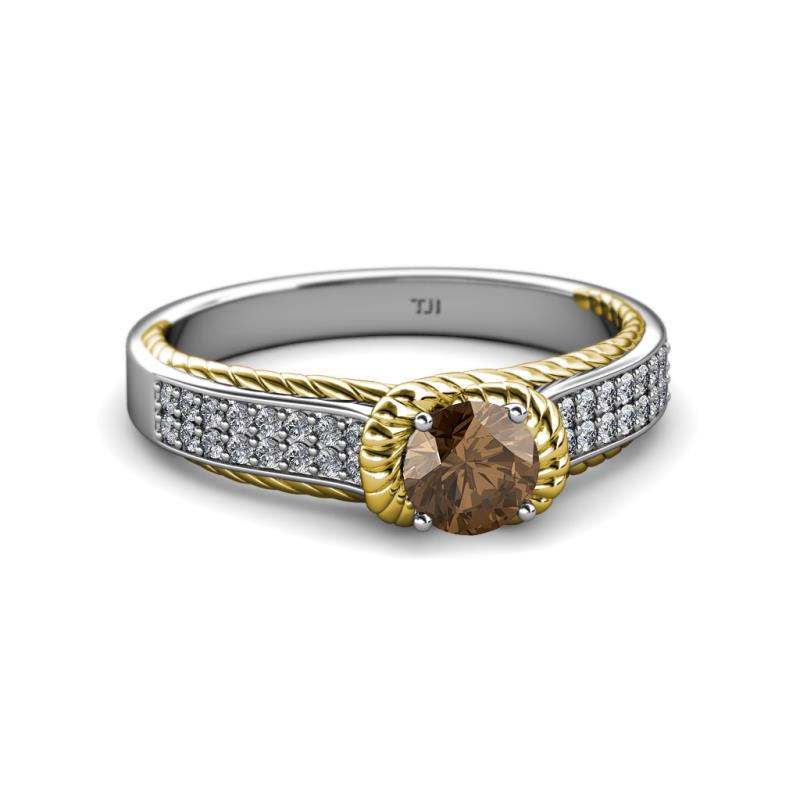 This Elegantly Designed Two Tone Solitaire Plus Engegement Ring in 18K White Gold have Double Row of Diamonds with Smoky Quartz that is artstically surrounded with Yellow Gold Rope which continues to adorn the Shank overlapping below the Head giving a Heavenly beauty and timeless Elegance.
