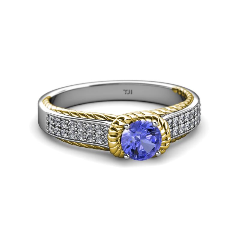This Elegantly Designed Two Tone Solitaire Plus Engegement Ring in 14K White Gold have Double Row of Diamonds with Tanzanite that is artstically surrounded with Yellow Gold Rope which continues to adorn the Shank overlapping below the Head giving a Heavenly beauty and timeless Elegance.