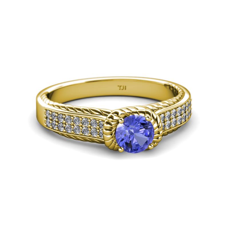 This Elegantly Designed Solitaire Plus Engagement Ring in 18K Yellow Gold have Double Row of Diamonds with Tanzanite that is artstically surrounded with Yellow Gold Rope which continues to adorn the Shank overlapping below the Head giving a Heavenly beauty and timeless Elegance.