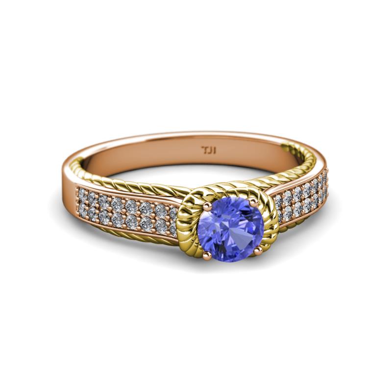 This Elegantly Designed Two Tone Solitaire Plus Engegement Ring in 18K Rose Gold have Double Row of Diamonds with Tanzanite that is artstically surrounded with Yellow Gold Rope which continues to adorn the Shank overlapping below the Head giving a Heavenly beauty and timeless Elegance.