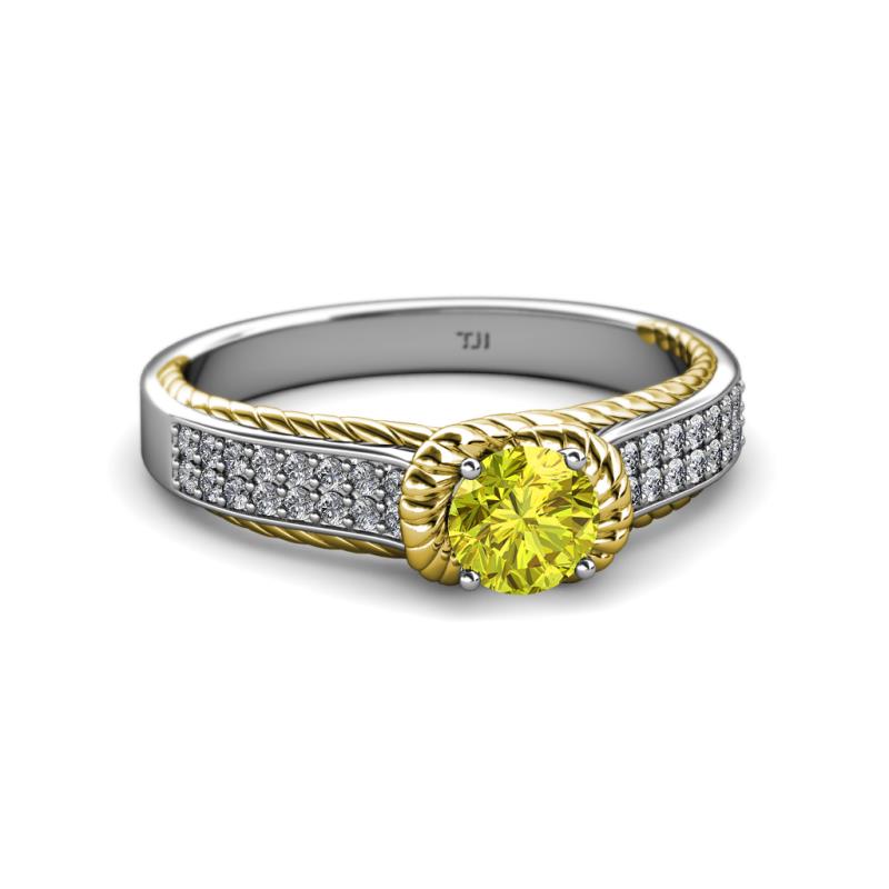 This Elegantly Designed Two Tone Solitaire Plus Engegement Ring in 18K White Gold have Double Row of Diamonds with Yellow Diamond that is artstically surrounded with Yellow Gold Rope which continues to adorn the Shank overlapping below the Head giving a Heavenly beauty and timeless Elegance.