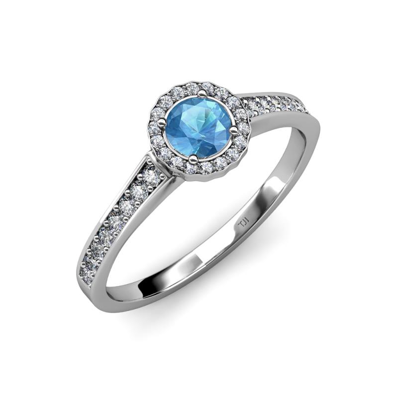 Celebrate the priceless moment of your life with 1.04 ct tw Halo Engagement Ring with Center Blue Topaz flared by halo of Diamonds which continue to illuminate the shank making it a symbol of your unending love.