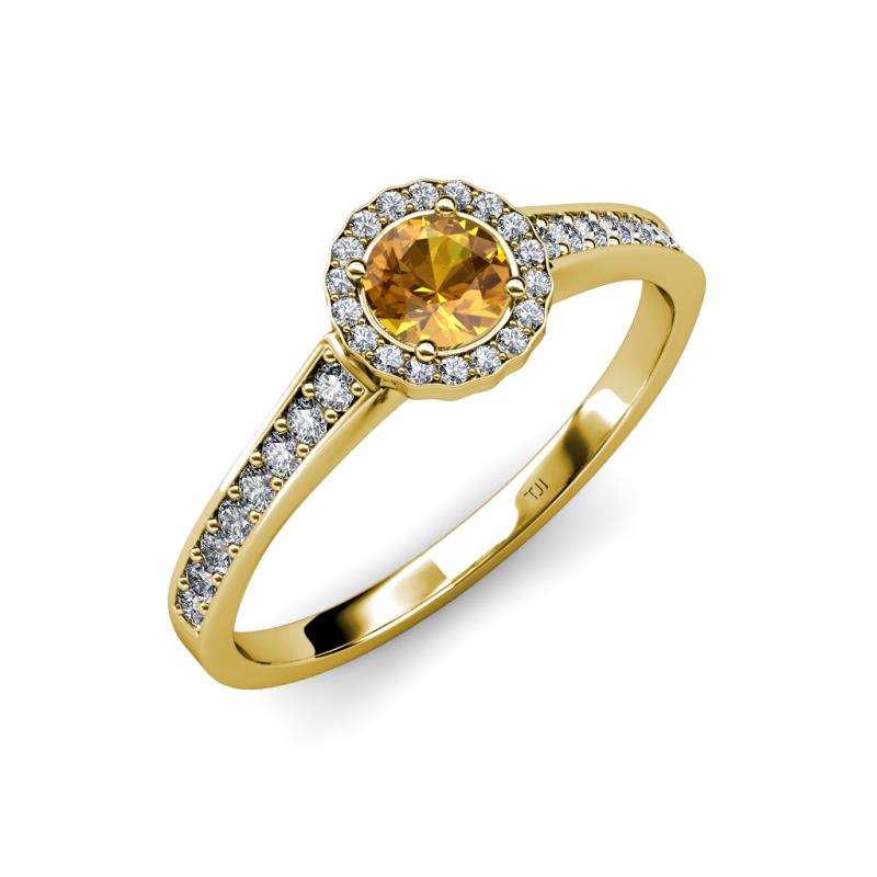Celebrate the priceless moment of your life with 0.91 ct tw Halo Engagement Ring with Center Citrine flared by halo of Diamonds which continue to illuminate the shank making it a symbol of your unending love.