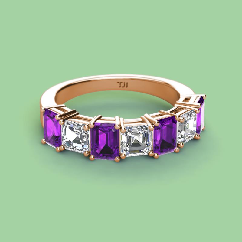Emerald Cut (6x4 mm) Amethyst and Asscher Cut Diamond 3.90 ctw* 7 Stone Shared Prong with Side Gallery Work Womens Wedding Band Stackable 18K Rose Gold More Details ...