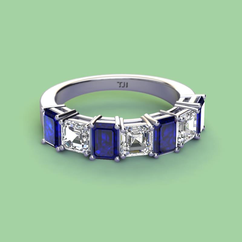 Looking for a vintage style wedding band? Look no further. This band features a center Four Emerald Cut Blue Sapphire plus three Asscher Cut Diamond is stunning enough to stand alone.