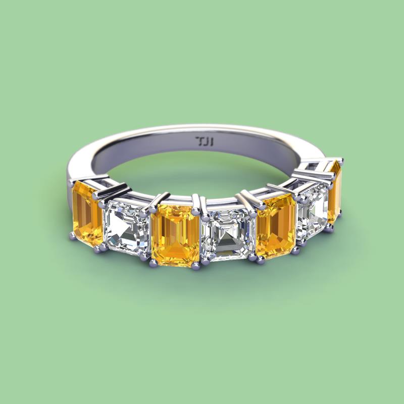 Looking for a vintage style wedding band? Look no further. This band features a center Four Emerald Cut Citrine plus three Asscher Cut Diamond is stunning enough to stand alone.
