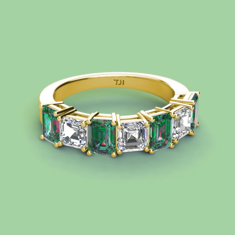 Looking for a vintage style wedding band? Look no further. This band features a center Four Emerald Cut Lab Created Alexandrite plus three Asscher Cut Diamond is stunning enough to stand alone.
