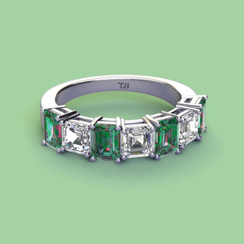Looking for a vintage style wedding band? Look no further. This band features a center Four Emerald Cut Lab Created Alexandrite plus three Asscher Cut Diamond is stunning enough to stand alone.