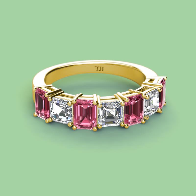 Emerald Cut (6x4 mm) Pink Tourmaline and Asscher Cut Diamond 3.90 ctw* 7 Stone Shared Prong with Side Gallery Work Womens Wedding Band Stackable 14K Yellow Gold More Details ...