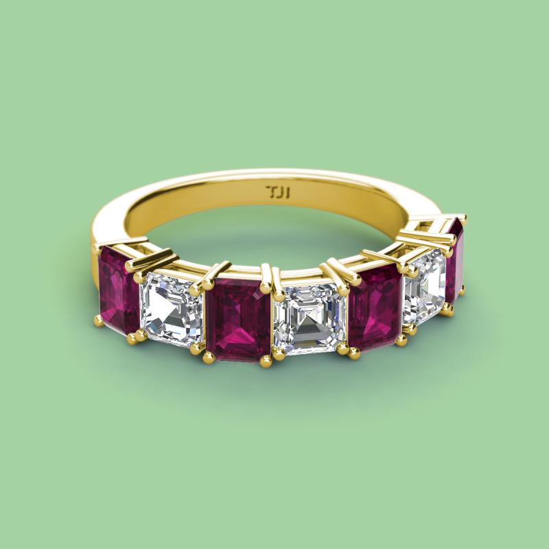 Emerald Cut (6x4 mm) Rhodolite Garnet and Asscher Cut Diamond 4.22 ctw* 7 Stone Shared Prong with Side Gallery Work Womens Wedding Band Stackable 14K Yellow Gold More Details ...