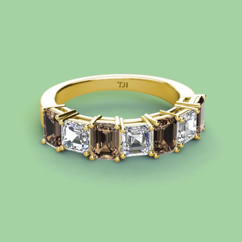 Looking for a vintage style wedding band? Look no further. This band features a center Four Emerald Cut Smoky Quartz plus three Asscher Cut Diamond is stunning enough to stand alone.