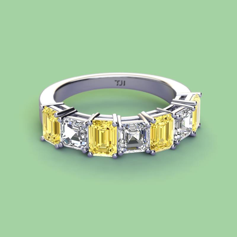 Looking for a vintage style wedding band? Look no further. This band features a center Four Emerald Cut Yellow Sapphire plus three Asscher Cut Diamond is stunning enough to stand alone.