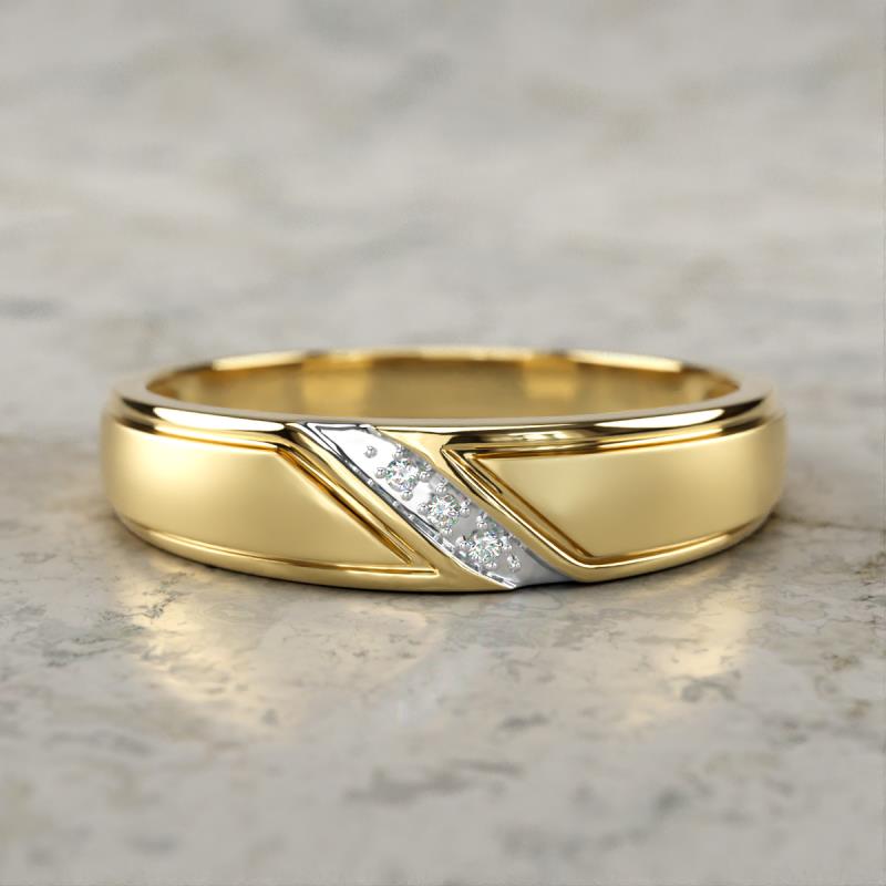 This unique and modern Wedding Band of 0.02 ctw features 3 Round Lab Grown Diamond set diagonally on the band, adding a touch of sophistication and elegance to the design along with Angled Brushed and Polished Finish of the band creates a contrasting effect, making the stones stand out even more. This wedding band is the perfect choice for the modern groom who wants a unique and stylish ring to wear every day