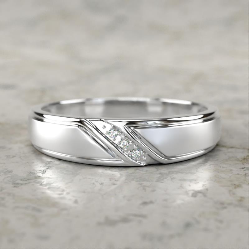 This unique and modern Wedding Band of 0.02 ctw features 3 Round Natural Diamond set diagonally on the band, adding a touch of sophistication and elegance to the design along with Angled Brushed and Polished Finish of the band creates a contrasting effect, making the stones stand out even more. This wedding band is the perfect choice for the modern groom who wants a unique and stylish ring to wear every day