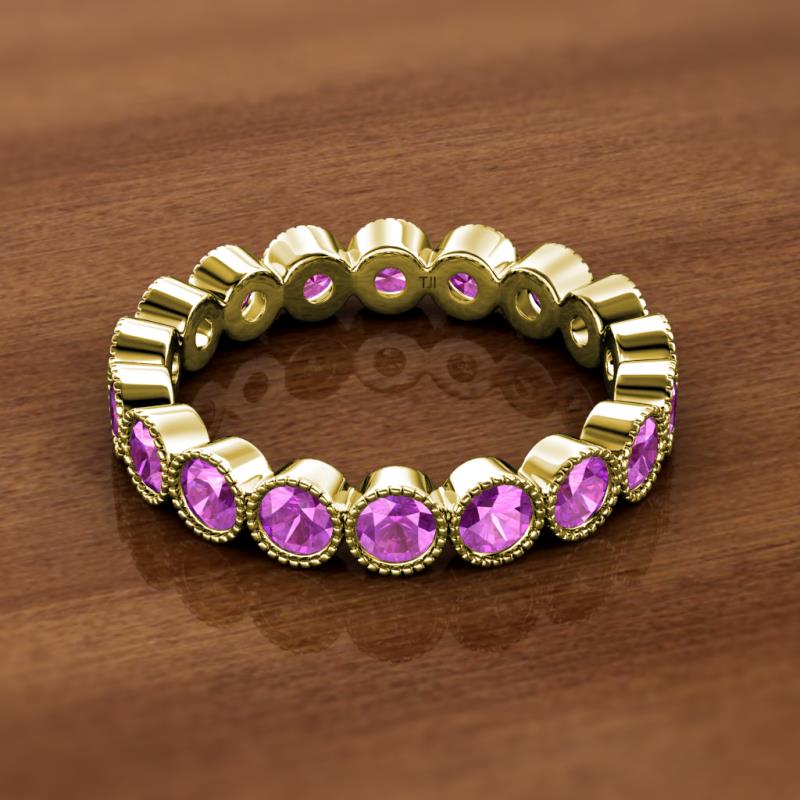 This Elegant Eternity band encircles the finger with Series of Amethyst in Milgrain-Texture with Bezel Setting which symbolizes the Eternal Circle of Love and cherishes its Shimmery Look. *As per ring size the stone and carat total weight changes.