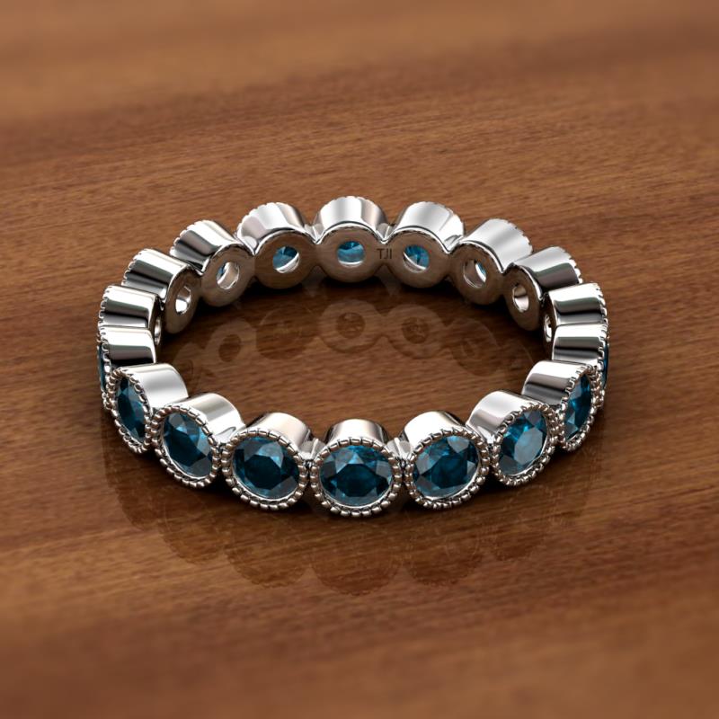 This Elegant Eternity band encircles the finger with Series of Blue Diamond in Milgrain-Texture with Bezel Setting which symbolizes the Eternal Circle of Love and cherishes its Shimmery Look. *As per ring size the stone and carat total weight changes.