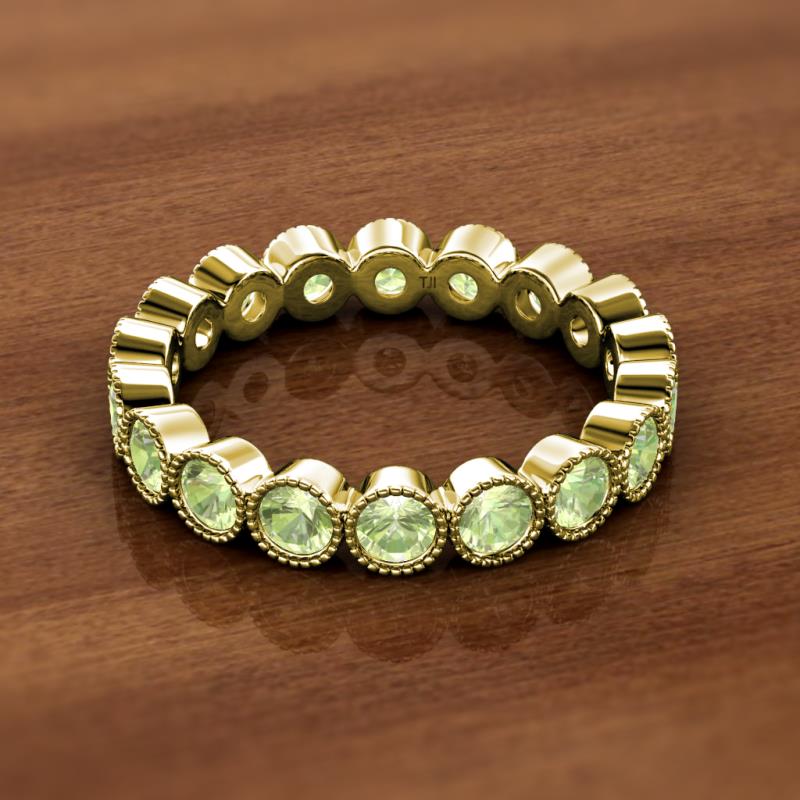 This Elegant Eternity band encircles the finger with Series of Peridot in Milgrain-Texture with Bezel Setting which symbolizes the Eternal Circle of Love and cherishes its Shimmery Look. *As per ring size the stone and carat total weight changes.