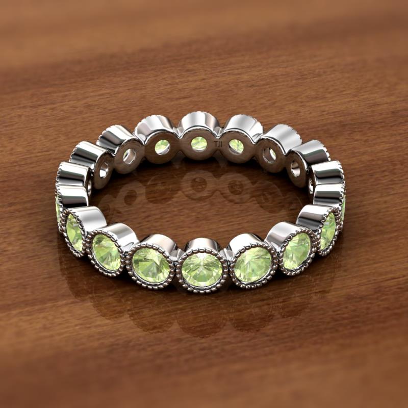 This Elegant Eternity band encircles the finger with Series of Peridot in Milgrain-Texture with Bezel Setting which symbolizes the Eternal Circle of Love and cherishes its Shimmery Look. *As per ring size the stone and carat total weight changes.