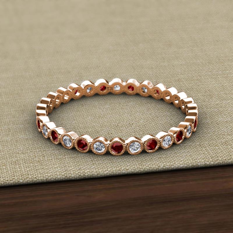 This Elegant Eternity band encircles the finger with Series of Red Garnet and Lab Grown Diamond in Milgrain-Texture with Bezel Setting which symbolizes the Eternal Circle of Love and cherishes its Shimmery Look. *As per ring size the stone and carat total weight changes.