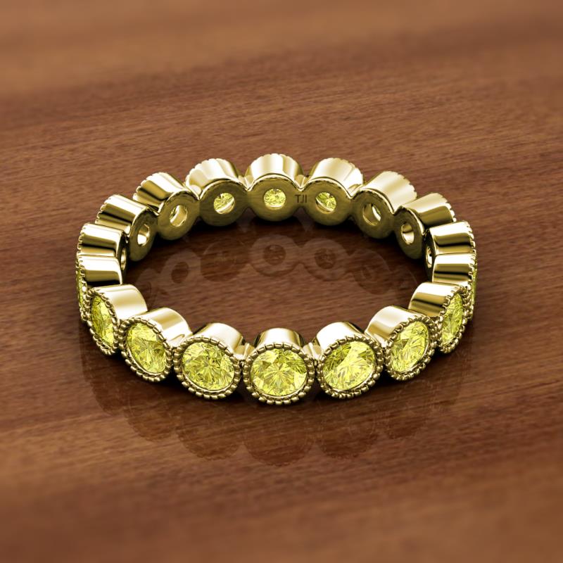 This Elegant Eternity band encircles the finger with Series of Yellow Diamond in Milgrain-Texture with Bezel Setting which symbolizes the Eternal Circle of Love and cherishes its Shimmery Look. *As per ring size the stone and carat total weight changes.