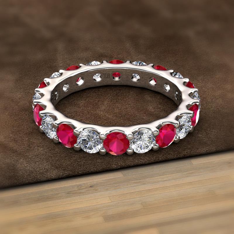 Slip this dazzling Band on her finger with Ruby and Lab Grown Diamond set using U-Prong across the width of the Band representing an Eternity of Love. *As per ring size the stone and carat total weight changes.