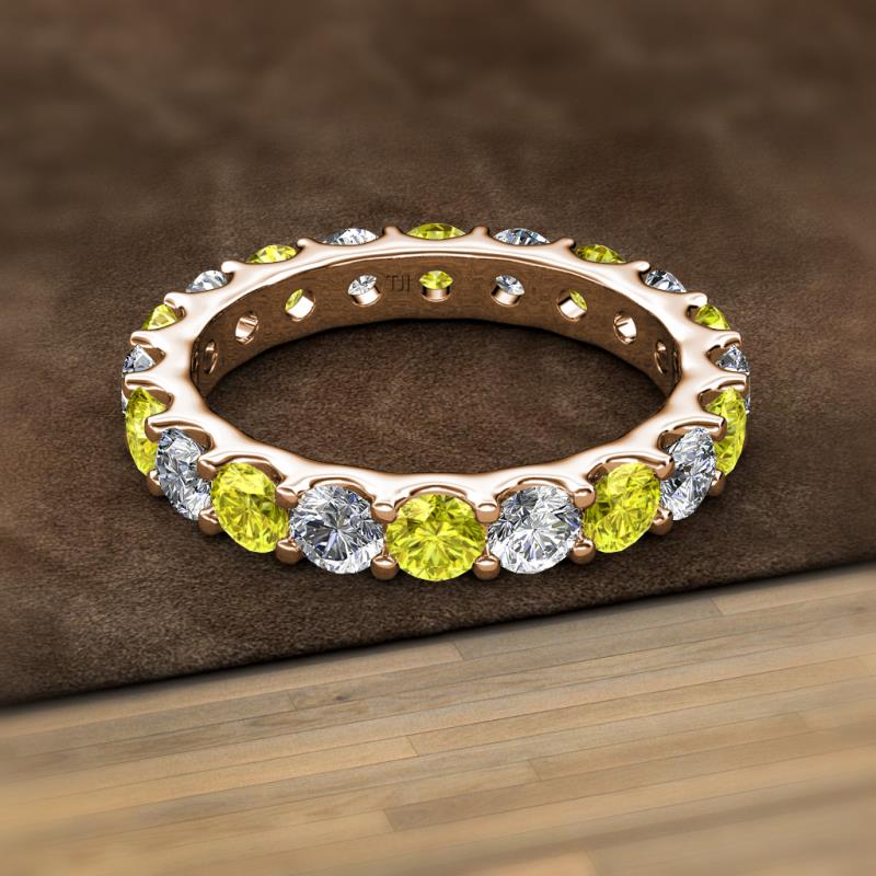 Slip this dazzling Band on her finger with Yellow and White Lab Grown Diamond set using U-Prong across the width of the Band representing an Eternity of Love. *As per ring size the stone and carat total weight changes.