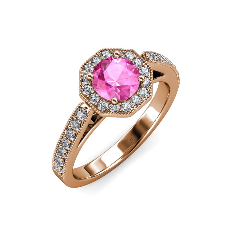 Let this enchanting Engagement Ring put your Love into words with Octagon Halo Frame of Diamonds bringing life to the Center Pink Sapphire enhancing its beauty with milgrain work on the edges.