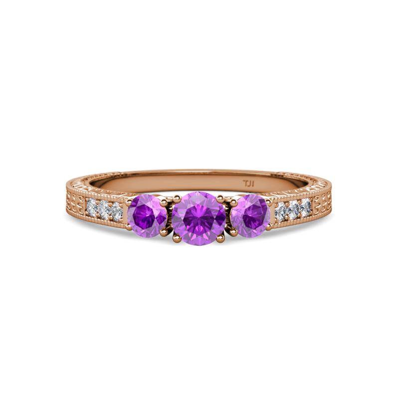 Round Amethyst Milgrain Womens Three Stone Engagement Ring with Diamond on Side Bar 3/4 ctw 14K Rose Gold More Details ...