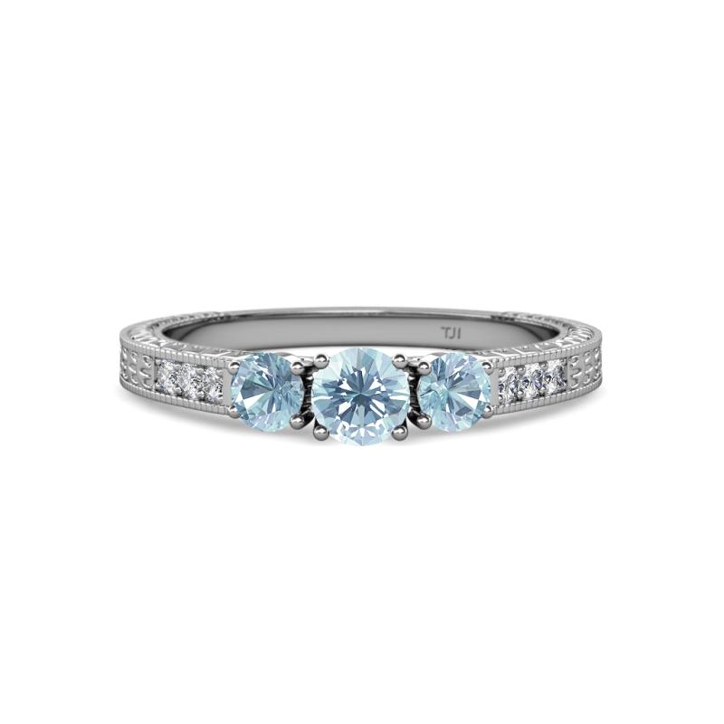Round Aquamarine Milgrain Womens Three Stone Engagement Ring with Diamond on Side Bar 3/4 ctw 14K White Gold More Details ...
