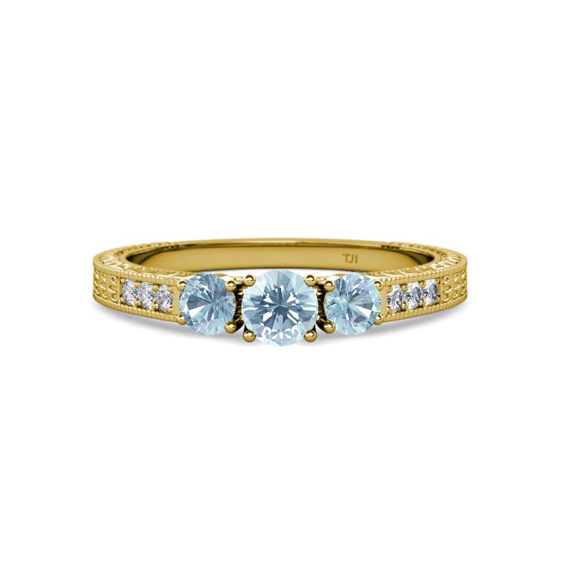 Round Aquamarine Milgrain Womens Three Stone Engagement Ring with Diamond on Side Bar 3/4 ctw 14K Yellow Gold More Details ...