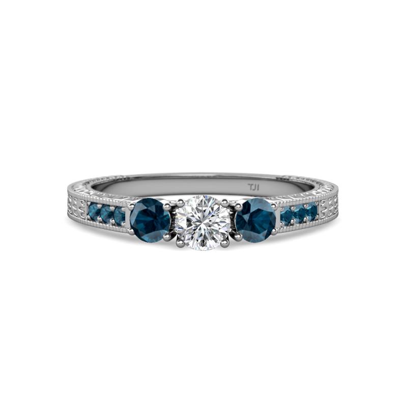 A stunning Center Diamond flanked by two Blue Diamond shines with smaller round Blue Diamond adorn this Milgrain Engagement Ring decorated with engraved edges making it look vintage and royal.