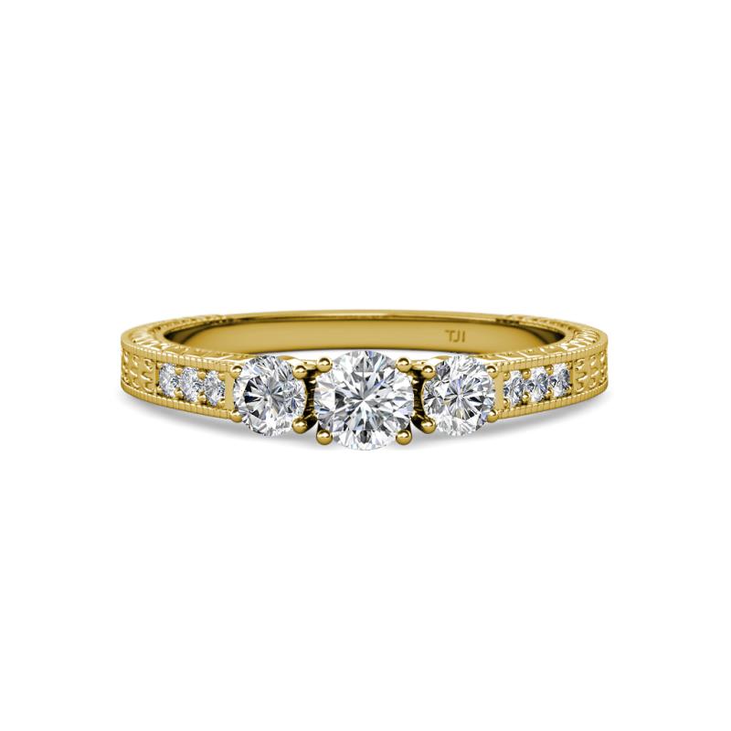 Round Diamond 3/4 ctw Milgrain Womens Three Stone Engagement Ring with Diamond on Side Bar 14K Yellow Gold More Details ...
