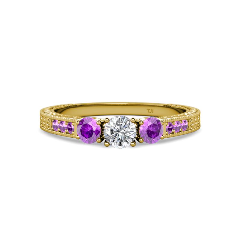Round Diamond and Amethyst 3/4 ctw Milgrain Womens Three Stone Engagement Ring with Amethyst on Side Bar 14K Yellow Gold More Details ...